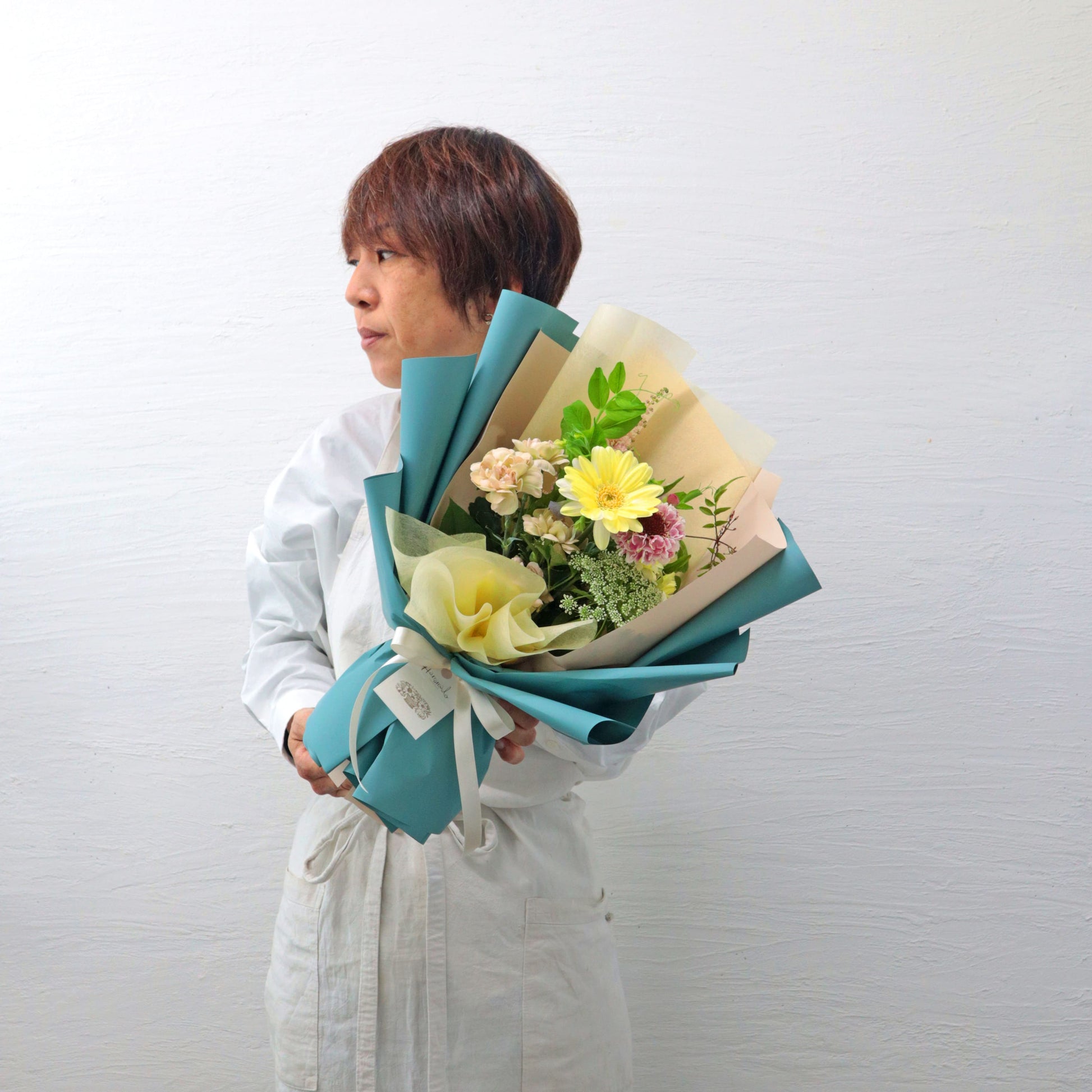 爽やかなブルーグリーンのラッピングに、ほんのり甘いアプリコットカラーの花が織りなすハーモニーは、